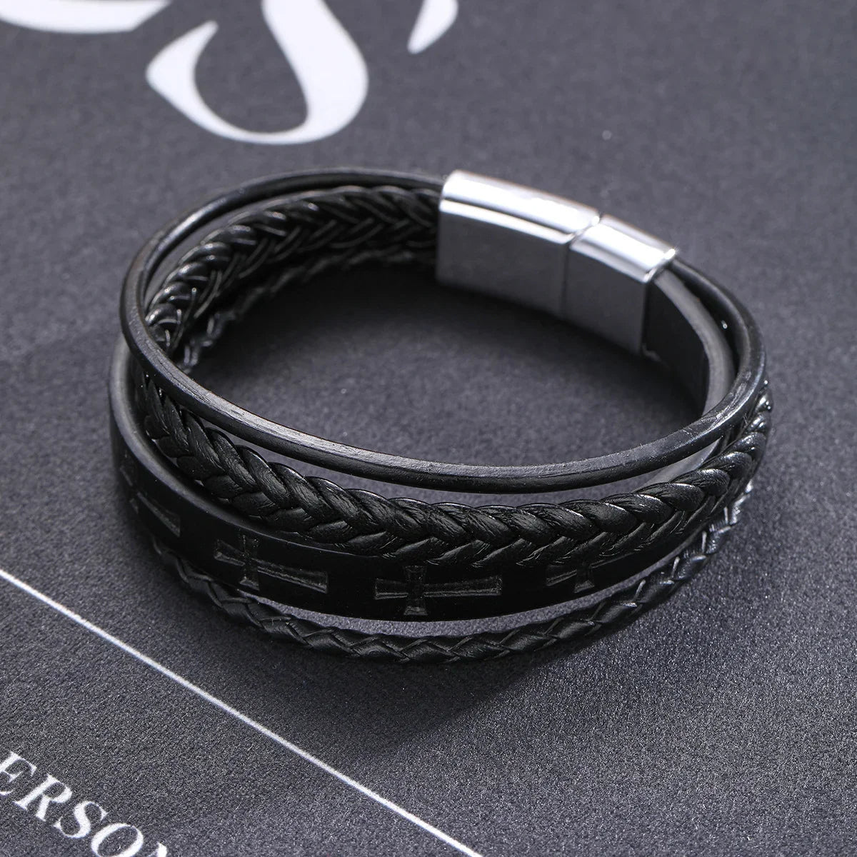This bracelet mesmerizes with its rich, braided leather and striking cross engravings, blending rugged charm with timeless sophistication. Wear it to infuse your look with a bold, personal statement that commands admiration wherever you go.
