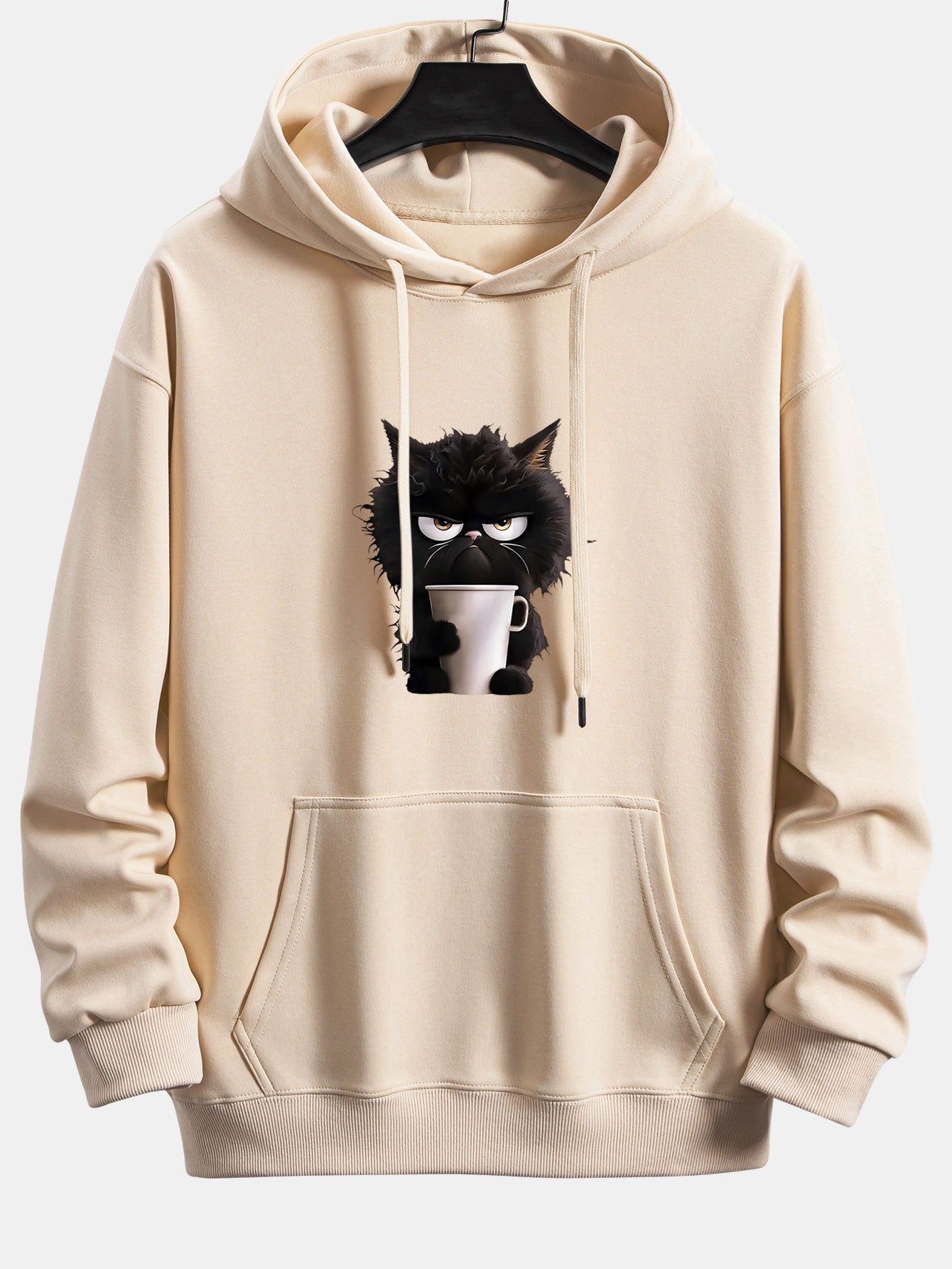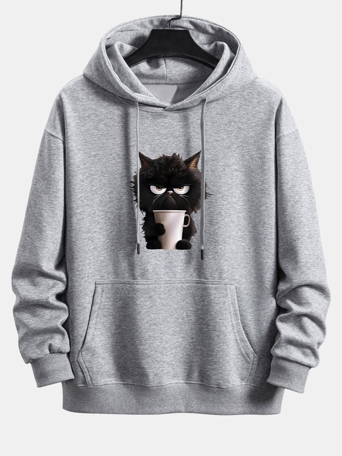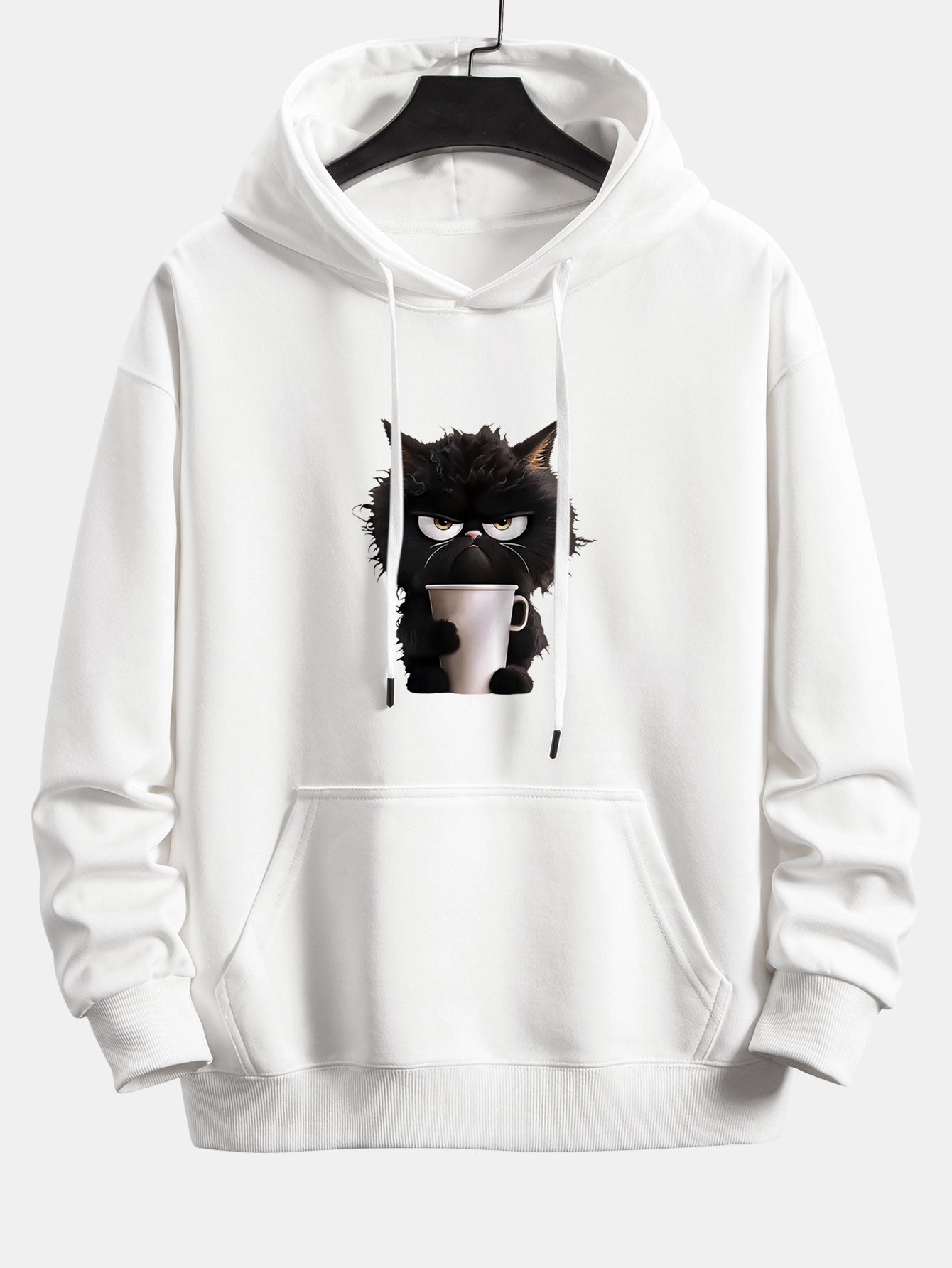 Black Cat Drinking Coffee Print Relax Fit Hoodie