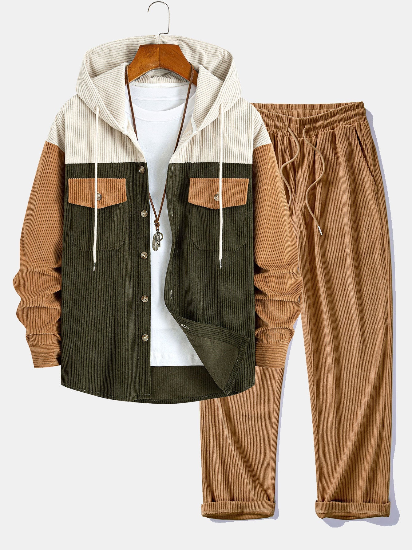 Relax Fit Corduroy Patchwork Hooded Shirt With Pockets & Straight Leg Corduroy Pants