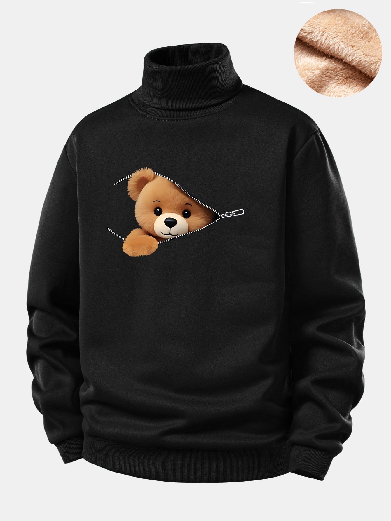 Zipper Bear Print Teddy Fleece Lined Turtle Neck Sweatshirt