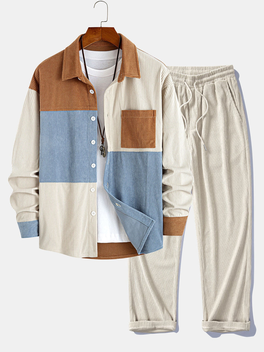 Relax Fit Corduroy Patchwork Hooded Shirt With Pockets & Straight Leg Corduroy Pants