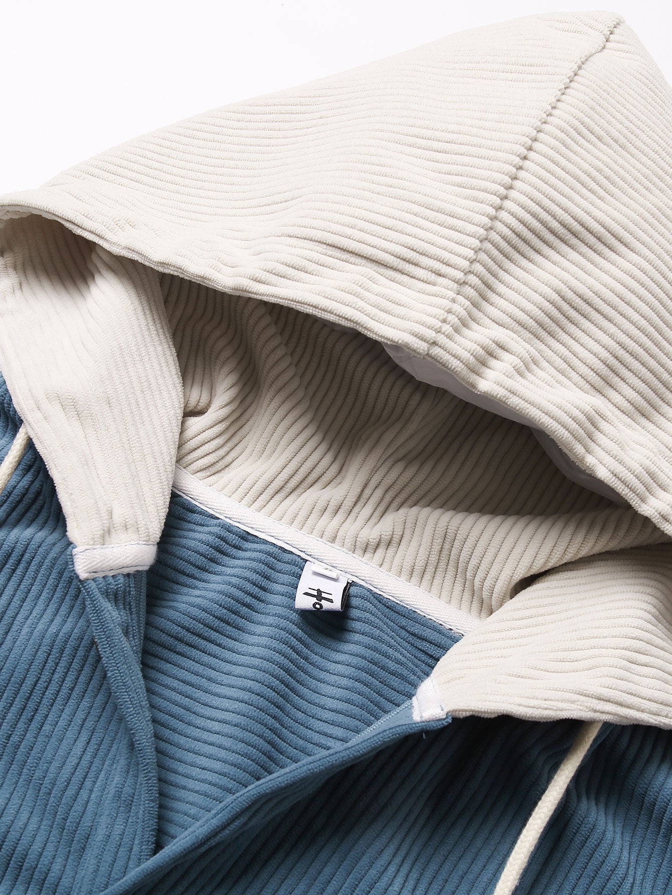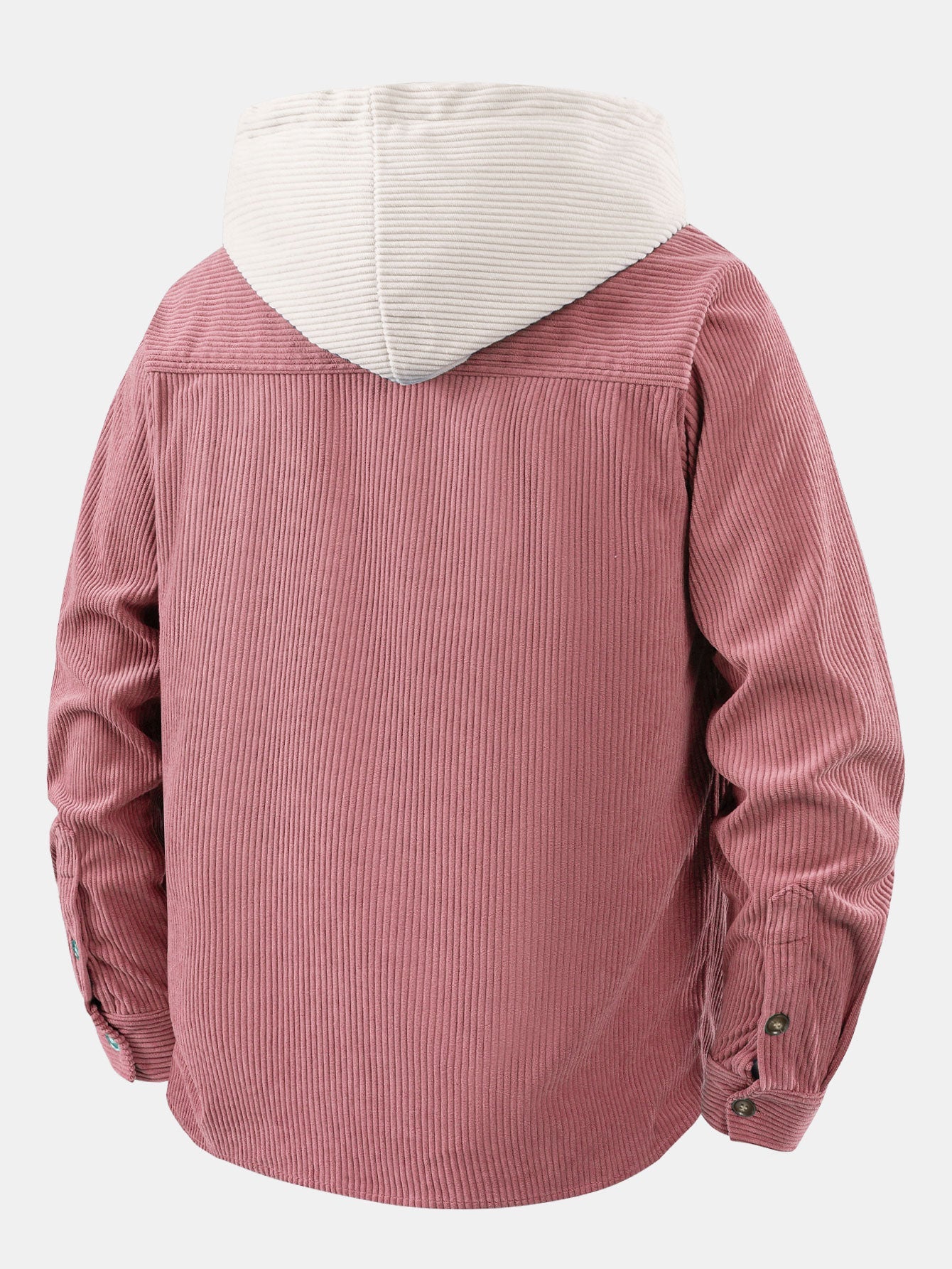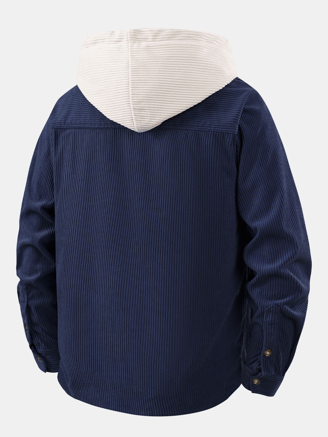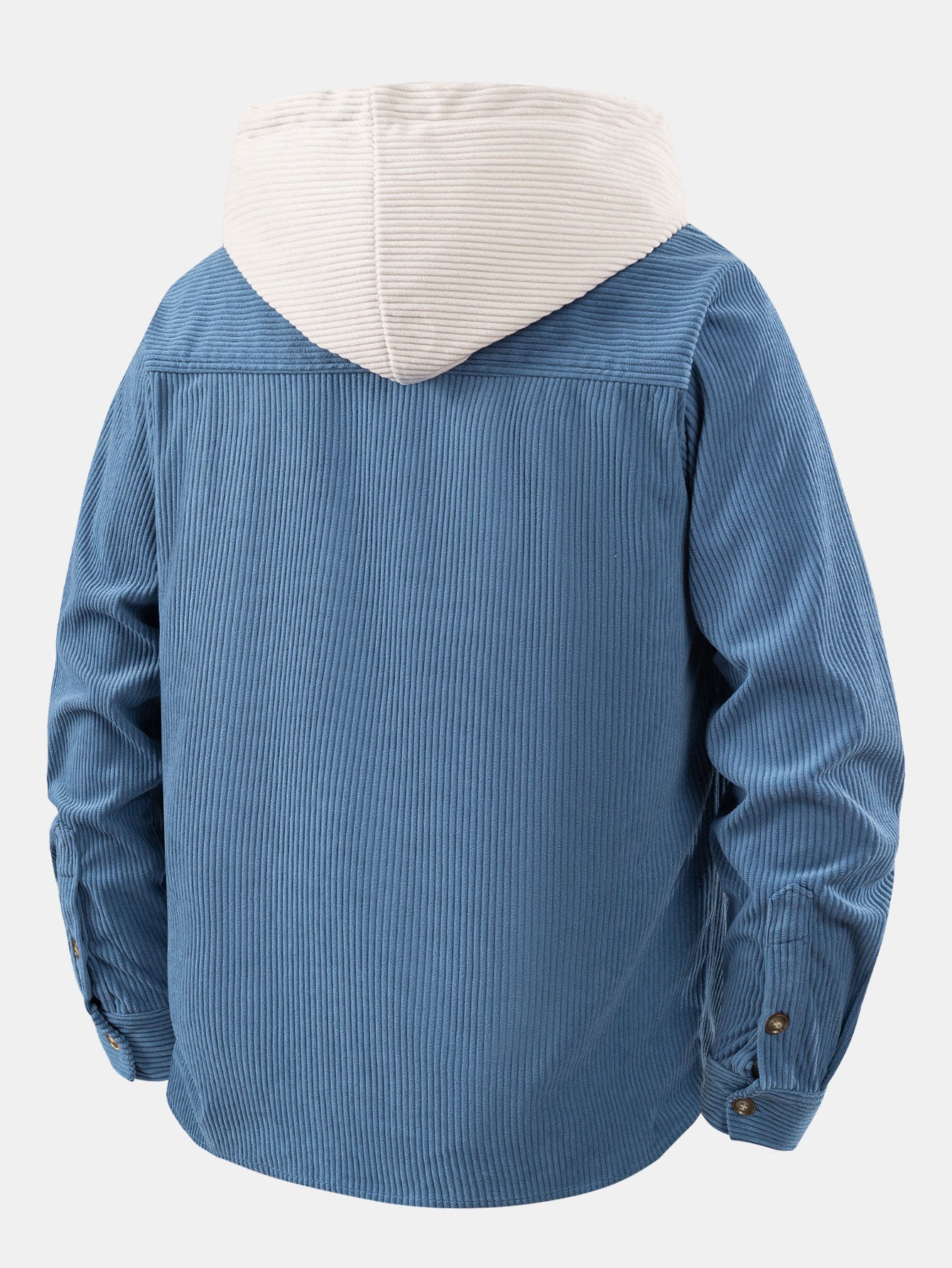 This casual hooded shirt is crafted from corduroy fabric, boasting a soft, vintage feel. The hood and chest patch pockets are paneled with off-white corduroy, creating a striking contrast with the main body and adding a sense of layering and design. Perfect for everyday wear or vacations in spring and autumn, it combines comfort and style.