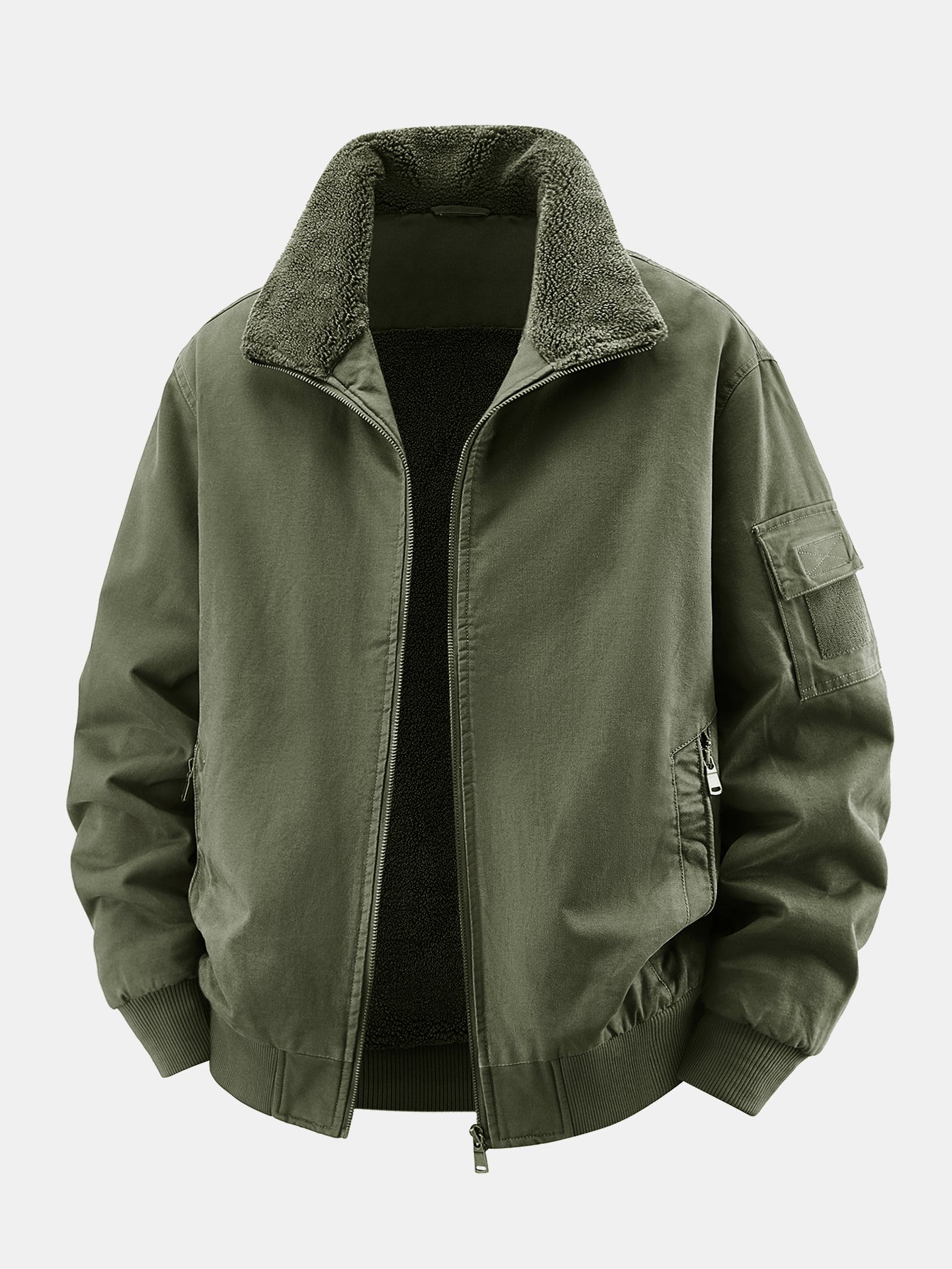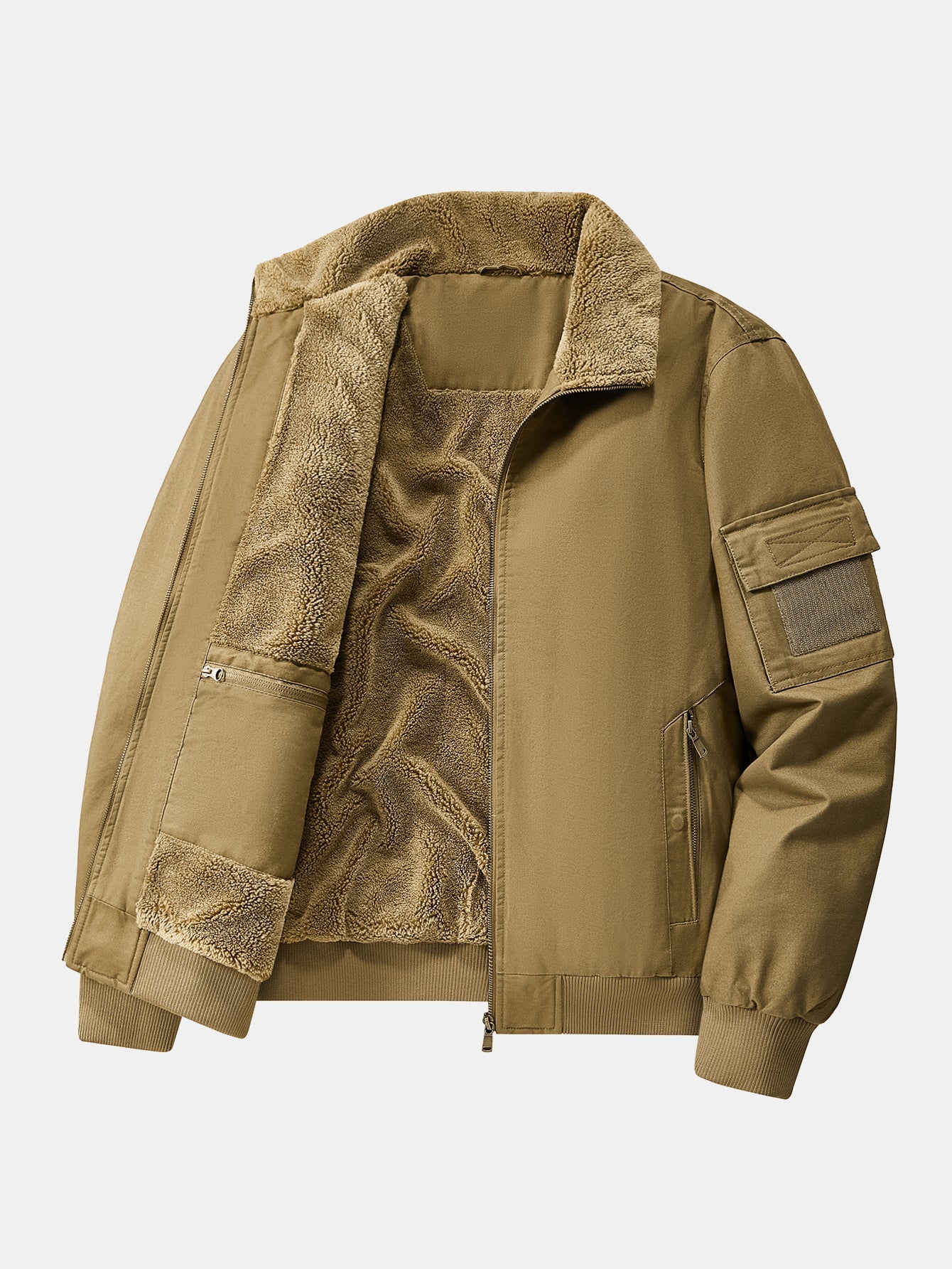 The outer shell features a classic bomber silhouette, while the interior is fully lined with soft teddy fleece for superior warmth on chilly days. A smooth front zipper makes it easy to layer, and the ribbed cuffs, collar, and hem provide a snug, structured fit. Practical side pockets add convenience, making this jacket an ideal choice for everyday wear.