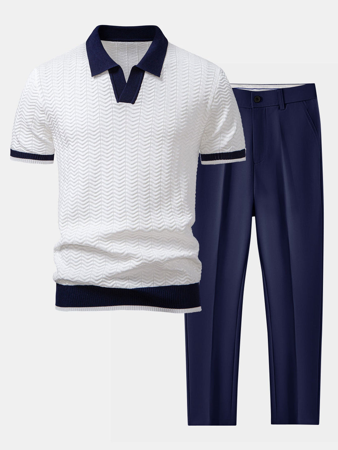 Texture Contrast Knitted V Neck Polo Shirt & Slim Fit Tapered Trousers